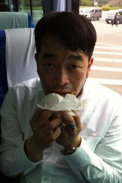 ぱぱが、にくまきおにぎりをたべてるわよ。
